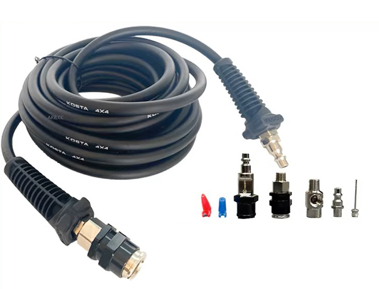 Шланг KOSTA для компрессора. Шланг воздушный используется для соединения компрессора с различными насадками. Шланг предназначен для использования совместно с компрессорами ARB, KOSTA, HF для подкачки колес внедорожника. На конце шланка установлен подпружиненный быстросъемный вентиль, позволяющий Вам не держать шланг у колеса автомобиля при накачке. В комплект набора входят различные фитинги, позволяющие подключать шланг к стандартным компрессорам.